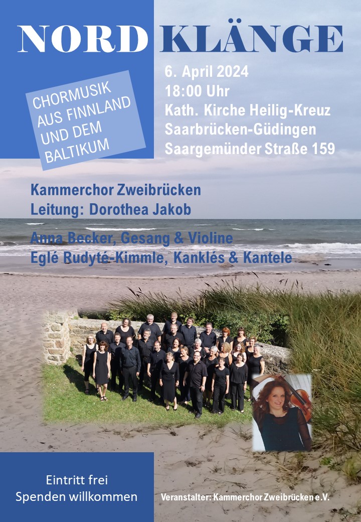 | 6. April 2024 | 18:00 Uhr Kath. Kirche Heilig-Kreuz, Saarbrücken-Güdingen | "Nordklänge": Musik aus Finnland und dem Baltikum mit dem Kammerchor Zweibrücken, Ltg. Dorothea Jakob, Anna Becker (Mezzosopran & Violine) und Eglé Rudyté-Kimmle (Kanklés und Kantele). |